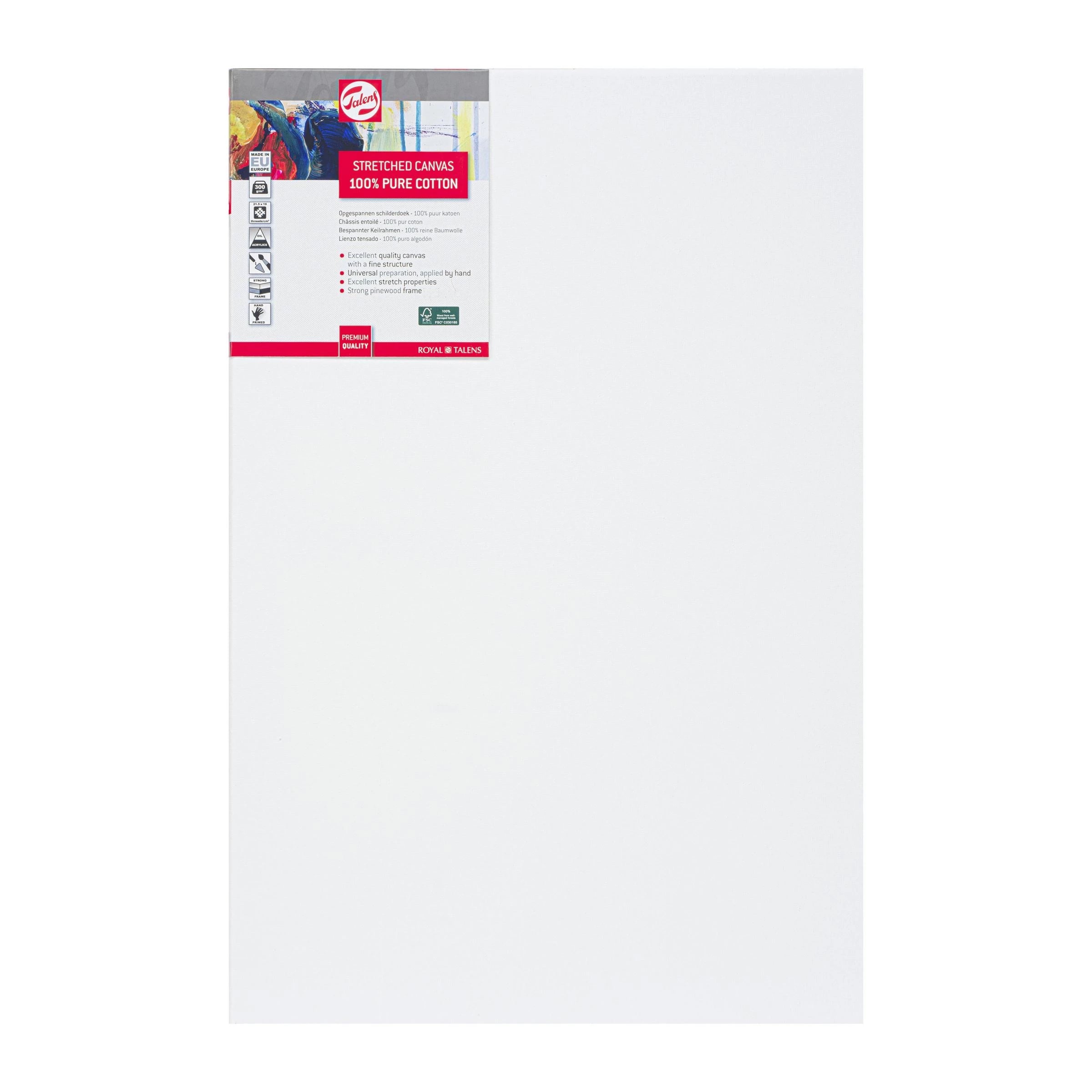 Talens biedt een ruim assortiment aan canvassen. Dit canvas is gemaakt van 100% katoen, weegt 300 gram per m² en heeft met 21,5 x 19 draden per cm² een fijne textuur. De latdikte van dit schildersdoek is 2 x 4,5 cm. Om de stevigheid van het spieraam te vergroten heeft dit doek een dwarslat.