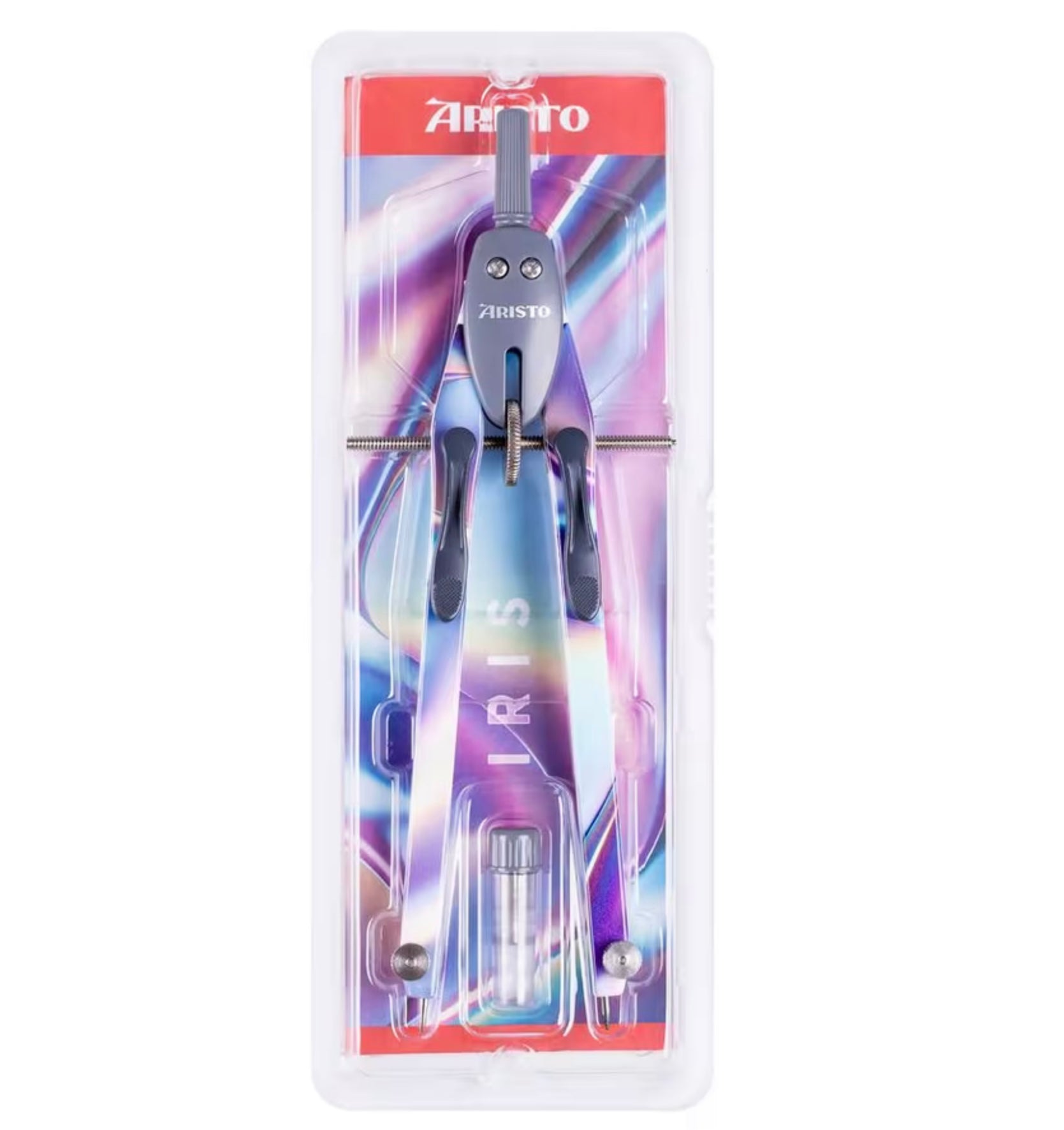 Deze snelverstelpasser heeft poten van gegoten zink in trendy design. Max. cirkelstraal van 340mm. Met hefboommechanisme met centreerwieltje voor fijnafstelling. De passer wordt geleverd in een transparant gekleurde doos met extra potloodstiftjes. Uitvoering bright iris.