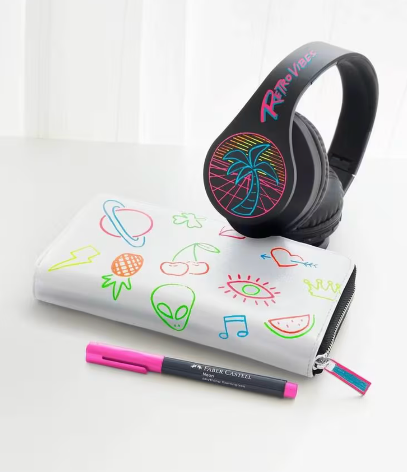 De neon markers zijn deco-markers (net zoals de metallic en creatief) voor het schilderen en creatief verfraaien van objecten (Porselein, glas, plastic, metaal, steen), wenskaarten en handlettering en voor het werken op donker en licht papier. De markers zijn beschikbaar in 6 kleuren. Inkt op waterbasis. Kan gebruikt worden op zowel absorberende (bijv. papier, karton , hout) en niet-absorberende (gladde) oppervlakken. De markers zijn veegvast en spatbestendig en waterproof na fixatie op 160 C in de oven (niet vaatwasmachinebestendig). Lijnbreedte: 1,5mm. De inkt drukt niet door het papier en is geurloos. Etui á 6 stuks assorti kleuren ( Yellow me happy, A little bit juicy, Little red corvette, Anything flamingoes, Electric storm, Karma Chameleon).