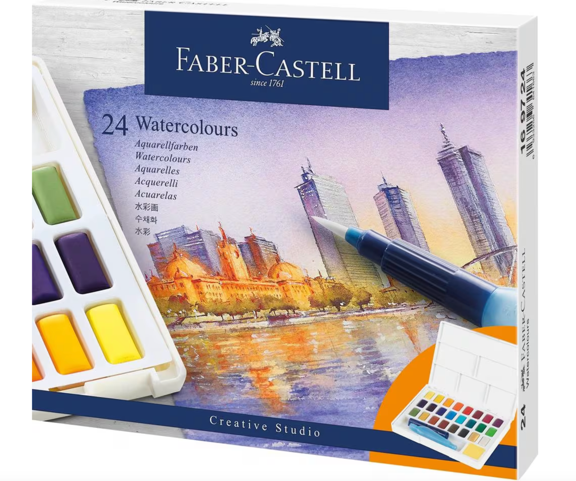• Set bevat 24 kleuren waterverf, Faber-Castell kleurennummers: 104, 108, 109, 113, 126, 133, 226, 284, 138, 120, 285, 145, 154, 158, 264, 166, 170, 183, 190, 188, 280, 199, 250 en 301.