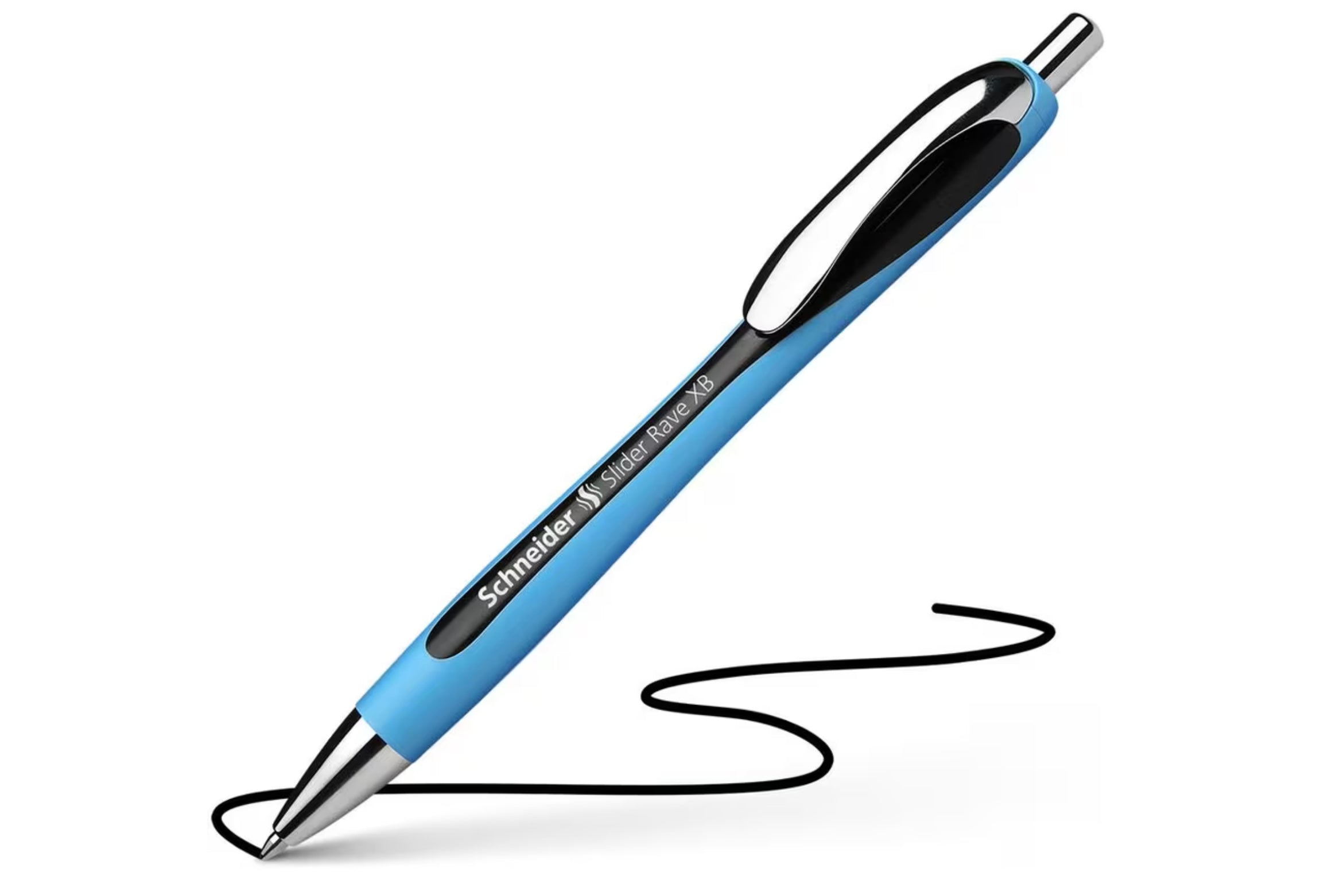 Balpen met Viscoglide®-technologie voor uitzonderlijk soepel en glijdend schrijven in extra brede schrijfstreepbreedte (XB). De Slider Rave is milieuvriendelijk en grondstofbesparend geproduceerd met een penhouder van 68% gerecycled plastic. Kleur behuizing blauw-zwart, schrijfkleur zwart, de inkt is waterbestendig en documentecht volgens inktnorm ISO 12757-2. Let op: waterbestendige inkt is beschermd tegen vocht, maar het is niet volledig watervast.De vervangbare Slider 755 XB vulling met slijtvaste roestvrijstalen punt garandeert dat de grote voorraad pasta volledig en zonder uitsmeren kan worden gebruikt. De inkt droogt snel - zelfs op glad papier - en blijft veegvast, zelfs wanneer u vervolgens markeert met markeerstiften. Dankzij het slimme Plug+Play-systeem kan de Slider Rave met verschillende navulformaten worden gevuld. De ergonomisch gevormde en royaal met rubber beklede houder maakt een ontspannen en prettige schrijfhouding mogelijk zonder de hand te vermoeien. Met praktische clip van stevig metaal. Schrijftlengte ca. 1.500 meter.