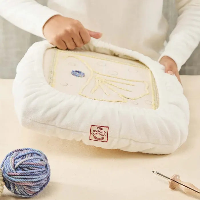 De Oxford beschermhoes gebruik je in combinatie met het Oxford punch frame. Het frame heeft kleine pinnetjes waarmee je de stof strak kunt opspannen. Om je handen en armen te beschermen tegen deze pinnetjes tijdens het punchen, is de beschermhoes ontwikkeld. De kussenzachte hoes voelt heerlijk aan onder je handen en je kunt je polsen er comfortabel op laten rusten tijdens het punchen. De beschermhoes bestaat uit twee lagen zachte fleece-stof met daartussen een dikke quiltvulling van polyester. Door het elastiek in de randen is de beschermhoes gemakkelijk om het frame te doen en blijft de hoes ook goed zitten. De hoes is machinewasbaar op lage temperatuur. Verkrijgbaar in verschillende maten, die corresponderen met de maten van de punch frames: